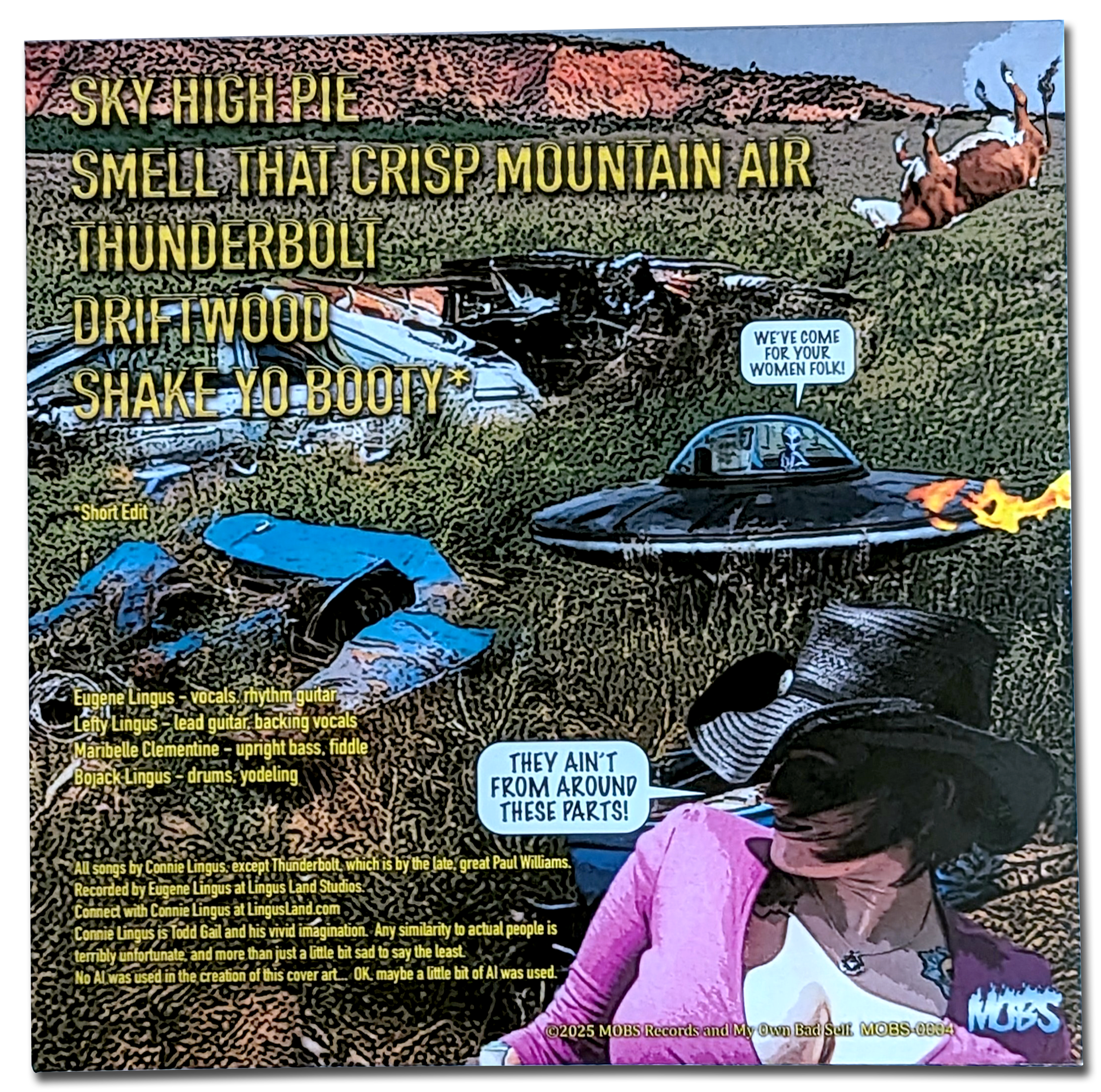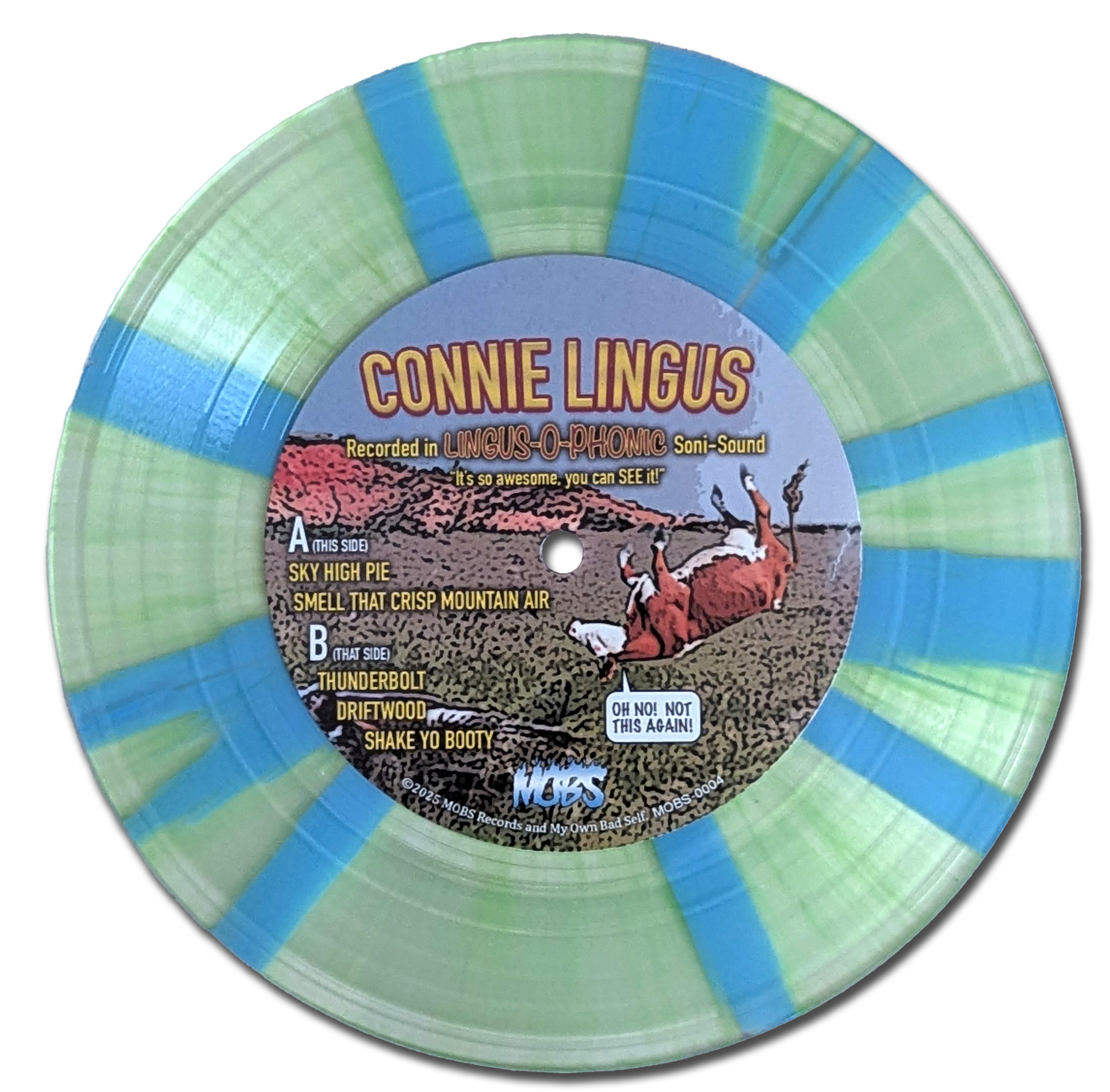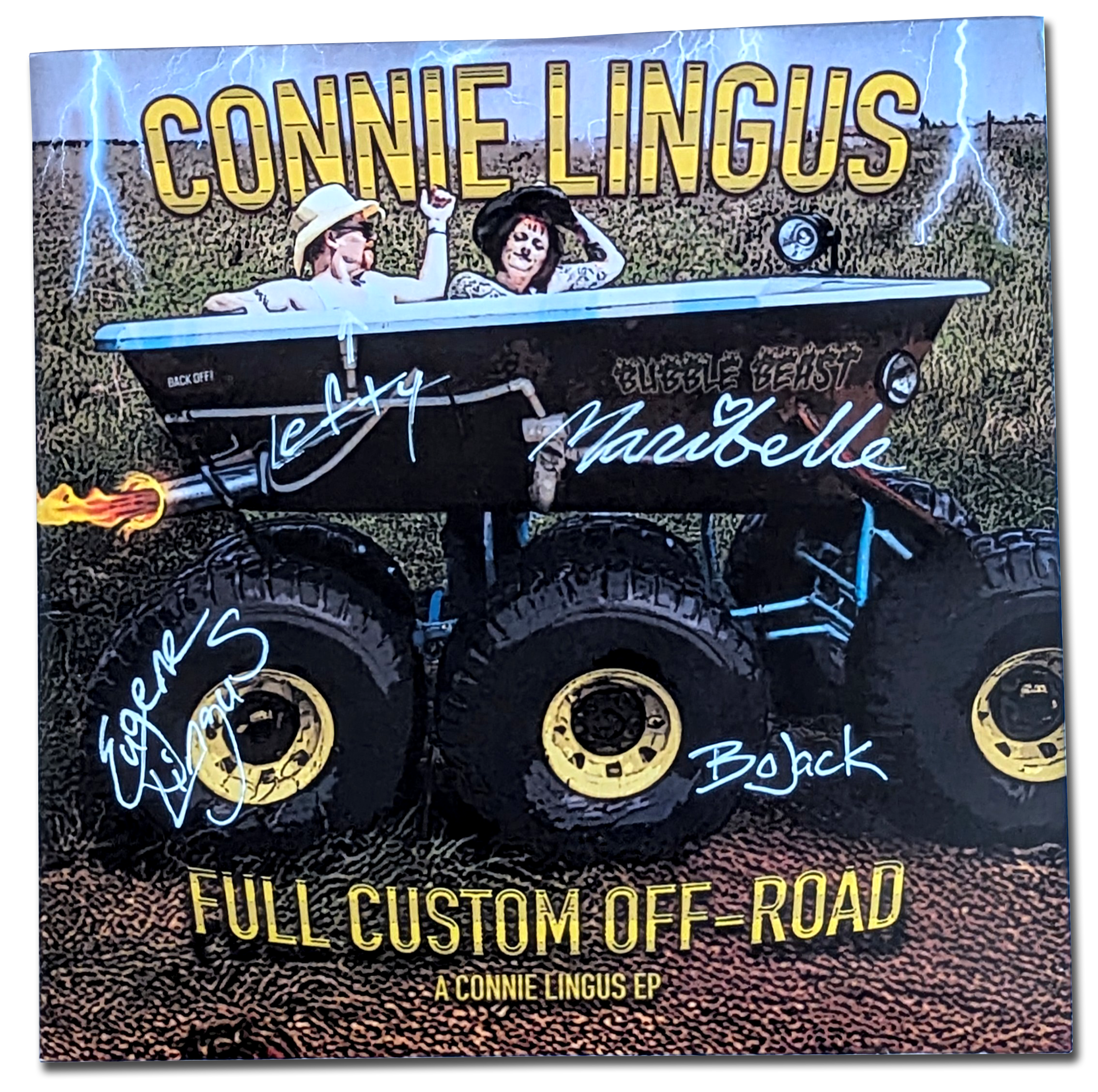 Hey! Check out this test pressing of Connie Lingus’ upcoming 7-inch EP, “Full Custom Off-Road” on transparent yellow, transparent green, and opaque blue splatter vinyl. Until its official release sometime in the coming months, only two copies of this here sparkling, multi-colored jewel exist - and only ONE copy is signed by every member of Connie Lingus! The second - and very much unsigned - copy of this record quickly found a cozy home in Eugene’s sprawling record collection, and has become a favorite spinning good time on his tricked-out turntable in the smoking lounge at Lingus Land Central.