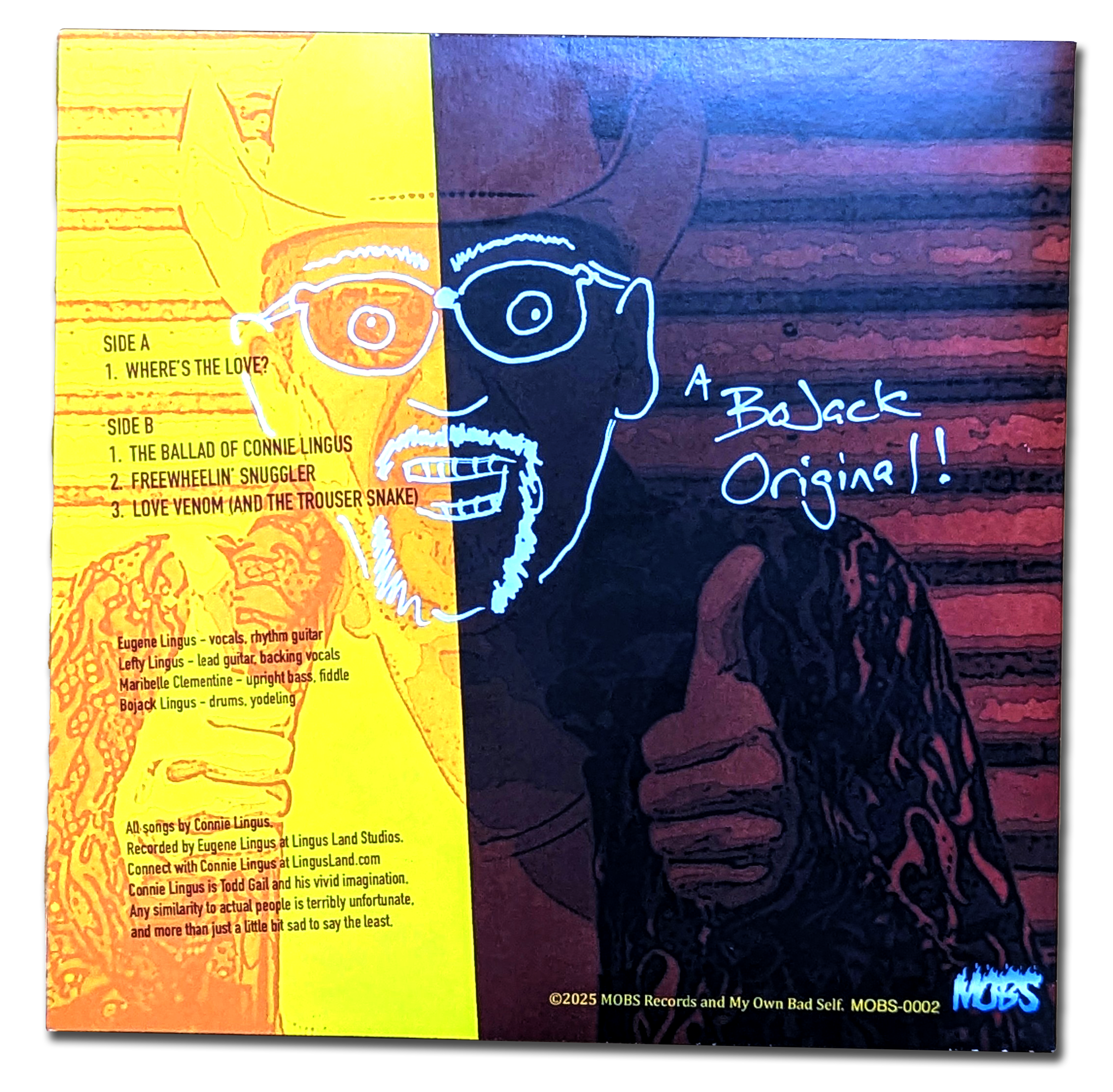 A special feature of this release is that it was “Recorded in LINGUS-O-PHONIC Soni-Sound”! What does that mean, exactly? Hell if we know, but according to the label, “It’s so awesome you can SEE it!” Wow! We here at Lingus Land Central are very much impressed by the sound of that there quotation! The only drawback we can find with this special disc is that BoJack was too lazy to draw a doodle sketch on it like he did for “Where’s The Love?”