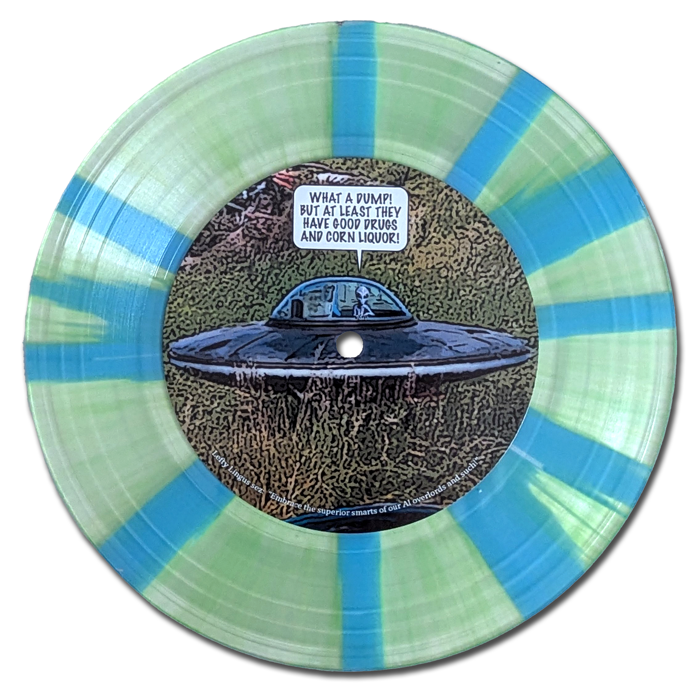 We also feel compelled to point out that the official release of this here EP will feature roughly the same colors, but will look distinctly different in order to ensure that this signed test pressing remains unique and therefore mega-special. We’ll add more blue to it, or something. We don’t know. Ain’t figured it out just yet. Don’t worry though, we still got plenty of time to hammer out the details on this here winner!